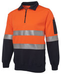 80% Polyester for durability, and 20% Cotton for comfort,280gsm fleece fabric,Complies with Standards AS/NZS 1906.4:2010 AS/NZS 4602.1:2011 Day and Night,Front contrast panel,Half-zip collar, Rib basque and cuffs with elastane,Pen pocket at sleeve,Easy care fabric